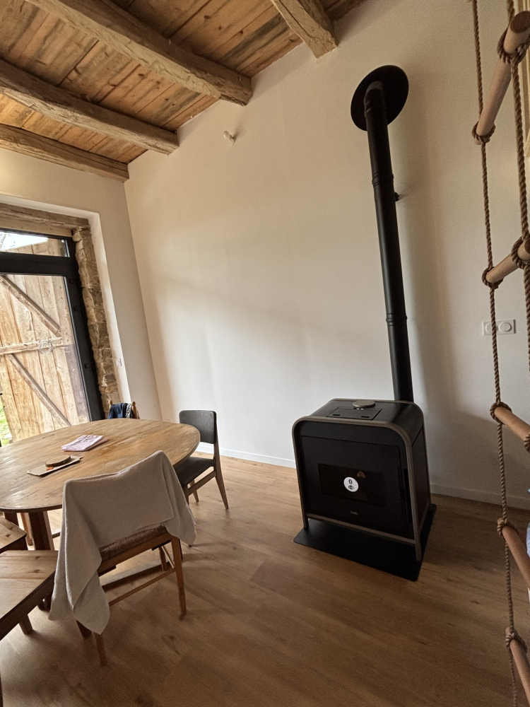 Sur le secteur de Buxy, votre artisan RGE qualibois B&C sarl à réalisé cette belle installation de poêle à granulé, avec calculs de puissance et du conduit de fumé pour une installation dans les normes.